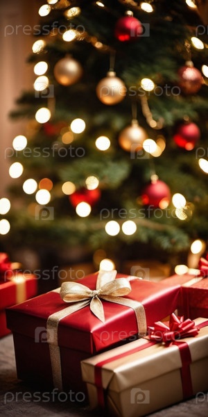 Уютная гостиная, украшенная праздничной рождественской елкой, украшенной сверкающими огнями и красочными безделушками, окруженная множеством тщательно упакованных подарочных коробок, ожидающих открытия. Искусство ИИ