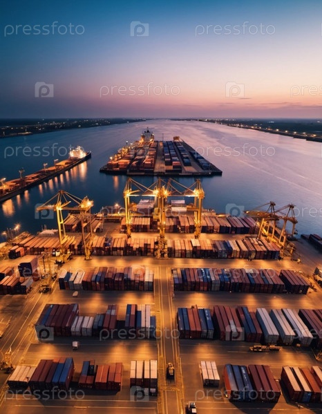 Вид с воздуха на рассвете показывает оживленный торговый порт с аккуратно сложенными контейнерами и кранами, готовыми к работе. Спокойные воды отражают мягкий утренний свет. Промышленная деятельность. Генеративный ИИ
