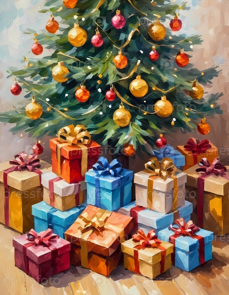 Декорированная рождественская елка, украшенная разноцветными игрушками и сложенными подарками, готова к празднованию в уютной праздничной обстановке. упакованные подарки разных цветов. Праздничная атмосфера, теплота и радость. AI