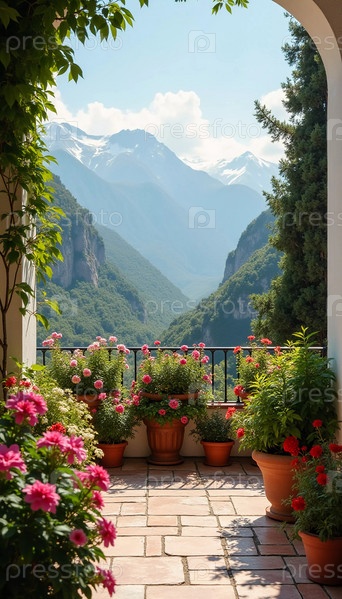 Солнечная терраса, окруженная яркими цветами, располагает к отдыху, предлагая захватывающий вид и уютное место со столиками и стульями. Терраса украшена цветущими цветами и живописными горами. Генеративный ИИ