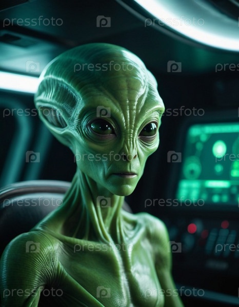 Встреча с инопланетянами в пустоте на борту футуристического космического корабля во время межзвездного путешествия через глубокий космос, раскрывающая таинственное существо. Генеративный ИИ