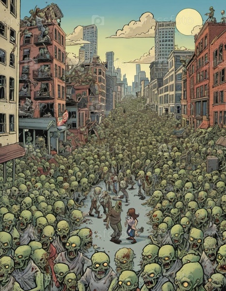 Оживленный город лежит в руинах, толпы зомби заполонили улицы, а одинокая фигура пробирается сквозь хаос во время драматического заката