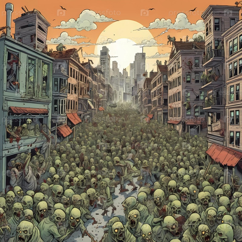 Оживленный город лежит в руинах, толпы зомби заполонили улицы, а одинокая фигура пробирается сквозь хаос во время драматического заката