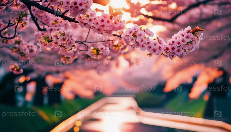 Сакура цветет. Нежные розовые цветы вишни красиво цветут на ветке дерева весной, наполняя сцену яркими цветами и чувством обновления в природе. Генеративный ИИ