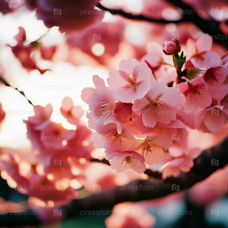 Сакура цветет. Нежные розовые цветы вишни красиво цветут на ветке дерева весной, наполняя сцену яркими цветами и чувством обновления в природе. Генеративный ИИ