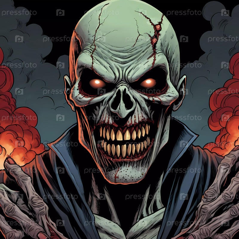 Появляется зловещая фигура со скелетной ухмылкой, окруженная огненными существами, готовыми к темному противостоянию. Генеративный ИИ