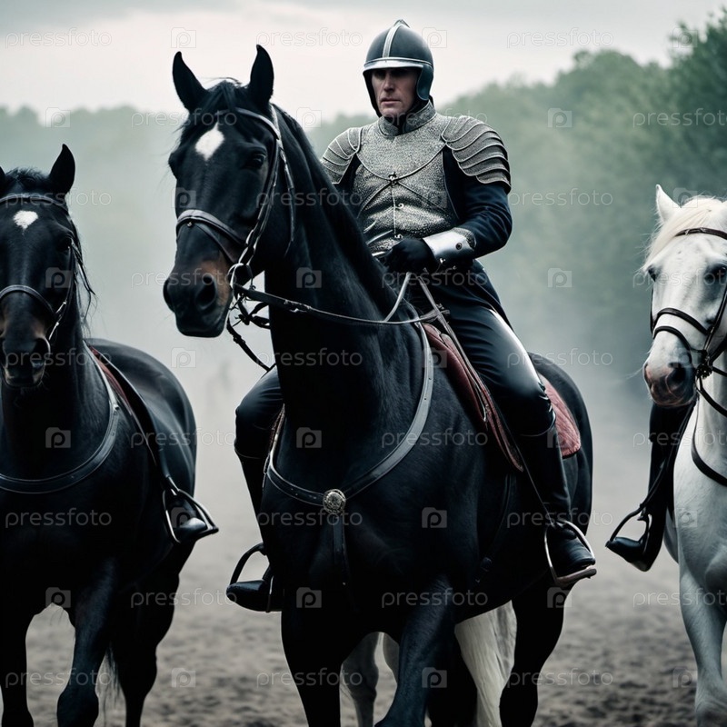 Группа бронированных всадников на сильных лошадях собирается на тихой лесной поляне, готовясь к тренировочным упражнениям на рассвете. Атмосфера спокойная, туман задерживается вокруг. Генеративный ИИ