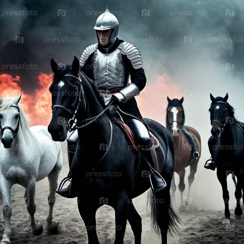 Группа бронированных всадников на сильных лошадях собирается на тихой лесной поляне, готовясь к тренировочным упражнениям на рассвете. Атмосфера спокойная, туман задерживается вокруг. Генеративный ИИ