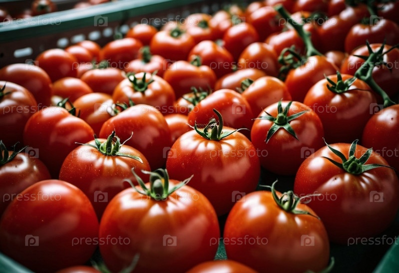 Супермаркет, полный красных томатов. Томаты сложены гроздьями. Свет отражается от поверхности томатов, подчеркивая яркий цвет и блестящую текстуру. Они были недавно собраны. Сгенерировано с помощью ИИ