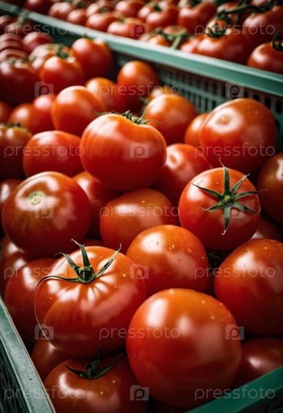 Супермаркет заполнен красными томатами. Томаты сложены гроздьями. Свет отражается от поверхности томатов, подчеркивая яркий цвет и блестящую текстуру. Они были недавно собраны. Генерация ИИ