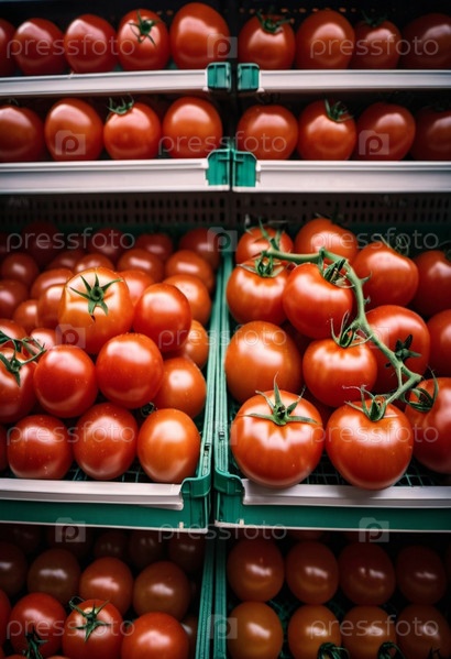 Супермаркет заполнен красными томатами. Томаты сложены гроздьями. Свет отражается от поверхности томатов, подчеркивая яркий цвет и блестящую текстуру. Они были недавно собраны. Генерация ИИ