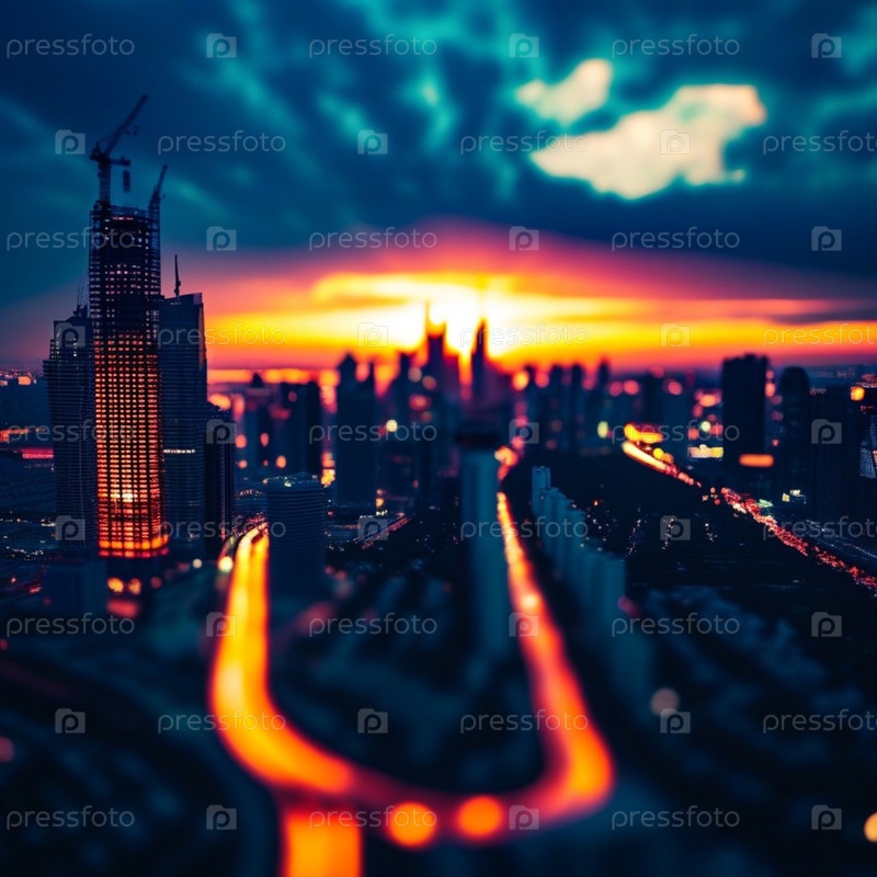 Захватывающий закат бросает теплый отблеск на возвышающиеся небоскребы в оживленном мегаполисе, создавая потрясающий контраст с красочным небом. Энергичная атмосфера городской жизни. Генеративный ИИ