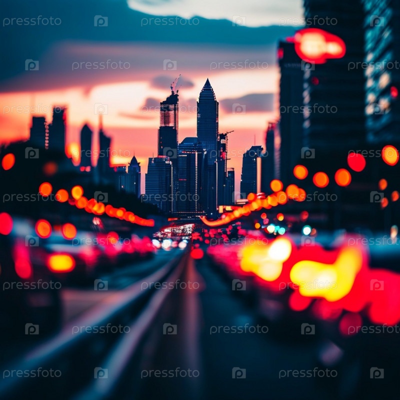Захватывающий закат бросает теплый отблеск на возвышающиеся небоскребы в оживленном мегаполисе, создавая потрясающий контраст с красочным небом. Энергичная атмосфера городской жизни. Генеративный ИИ