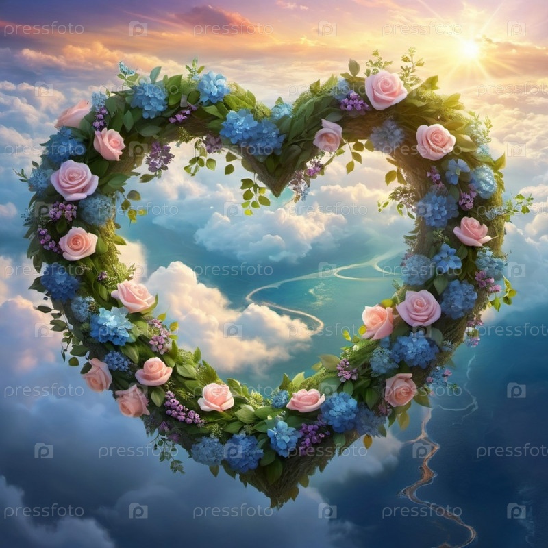Красивая композиция в форме сердца из красочных цветов парит в небе, окруженная мягкими облаками, когда солнце встает, создавая мирную и романтическую атмосферу. Генеративный ИИ. Печаль