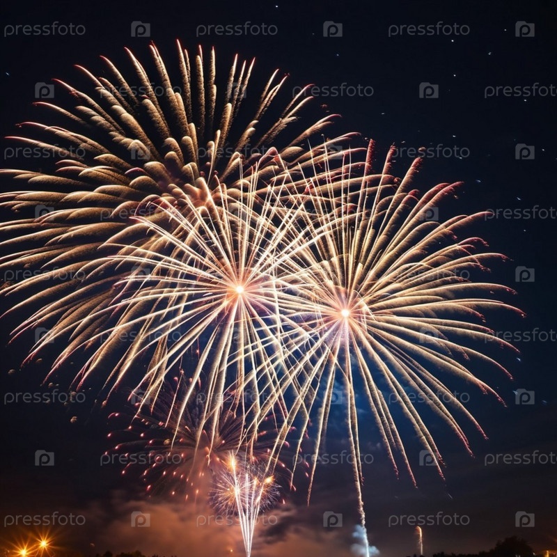 Яркое представление фейерверков освещает ночное небо. Большие вспышки света освещают темный холст выше, создавая завораживающее зрелище цвета и движения. Сгенерировано ИИ. Праздничный фон