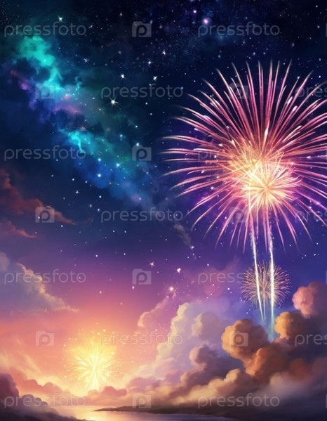 Яркое представление фейерверков освещает ночное небо. Большие вспышки света освещают темный холст выше, создавая завораживающее зрелище цвета и движения. Сгенерировано ИИ. Праздничный фон
