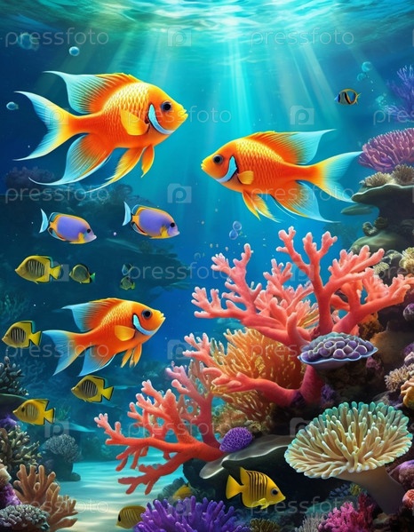 Яркие оранжево-бело-желто-синие-красные рифовые рыбы плавают через коралловый риф. Солнечные лучи проникают в морскую воду. Разнообразие животных. Экология гидросферы. Антропогенный фактор, влияющий на гибель коралловых рифов. AI