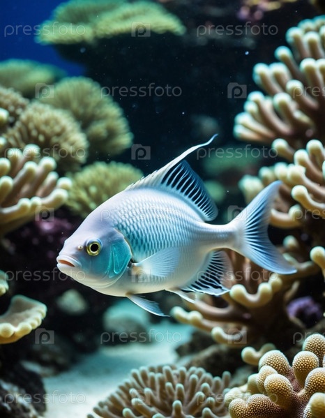 Яркие оранжево-бело-желто-синие-красные рифовые рыбы плавают через коралловый риф. Солнечные лучи проникают в морскую воду. Разнообразие животных. Экология гидросферы. Антропогенный фактор, влияющий на гибель коралловых рифов. AI