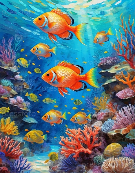 Яркие оранжевые, белые, желтые, синие, красные рифовые рыбы плавают через коралловый риф. Солнечные лучи пронзают морскую воду. Разнообразие животных. Экология гидросферы. Антропогенный фактор, влияющий на гибель коралловых рифов. ИИ