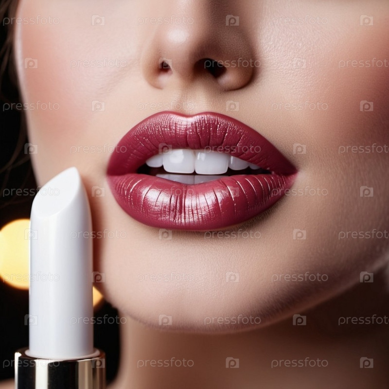 Крупный план женских губ, мерцающая бордово-бордовая помада, немного блеска. Губы слегка приоткрыты, открывая вид на белые зубы. Чувственность и сексуальность. Создано с помощью ИИ