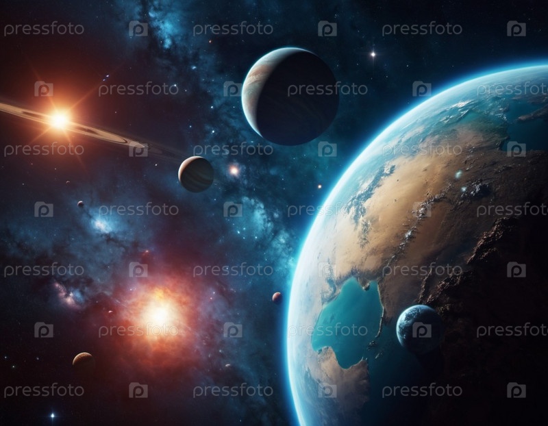 Планетарная система с несколькими планетами, большим ярко окрашенным газовым гигантом и каменистой планетой. Яркие звезды и огромное пространство темного космоса с галактикой на заднем плане. Космические просторы. Космонавтика. ИИ