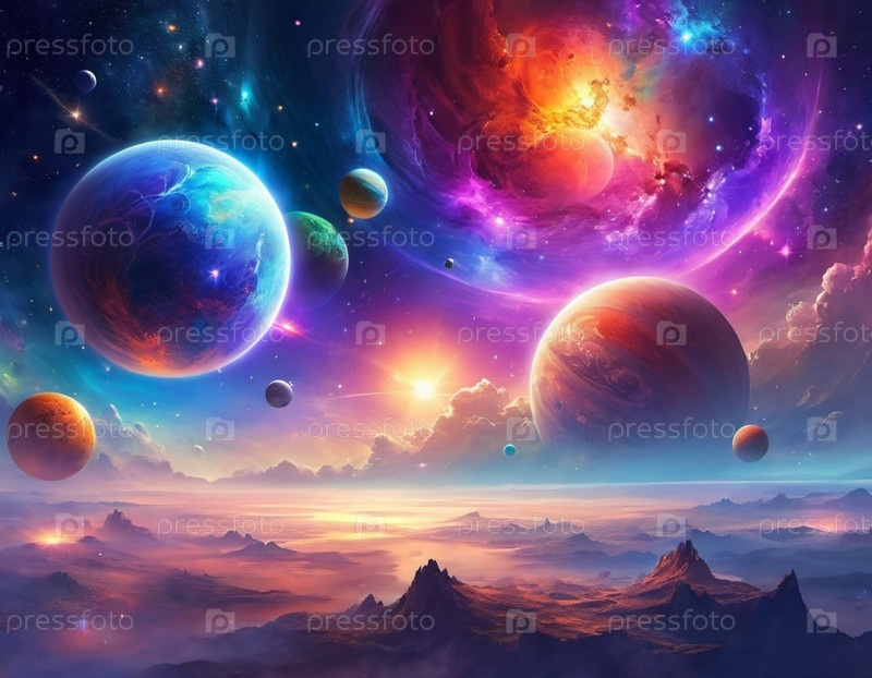 Планетарная система с несколькими планетами, большим ярко окрашенным газовым гигантом и каменистой планетой. Яркие звезды и огромное пространство темного космоса с галактикой на заднем плане. Космические просторы. Космонавтика. ИИ