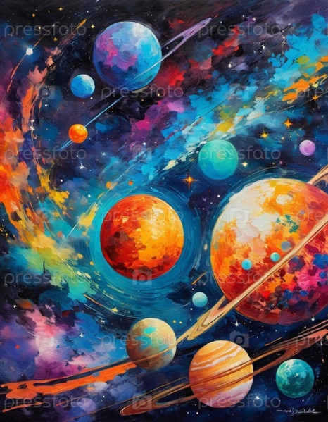 Планетарная система с несколькими планетами, большим ярко окрашенным газовым гигантом и каменистой планетой. Яркие звезды и огромное пространство темного космоса с галактикой на заднем плане. Космические просторы. Космонавтика. ИИ