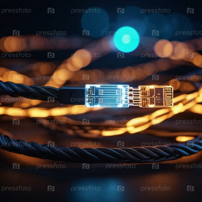 Синие и оранжевые светящиеся провода скручиваются и переплетаются на темном фоне с боке-огнями. Черные кабели и разъемы со светящимися огнями и цепями соединяются, образуя сеть. Создано с помощью ИИ