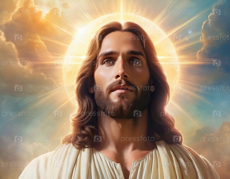 Портрет мужчины, одетого как Иисус. Белая мантия. Длинные каштановые волосы и борода. На вид мужчине около 30 лет, на лице серьезное выражение. Христианская религия и вера. Создано с помощью ИИ