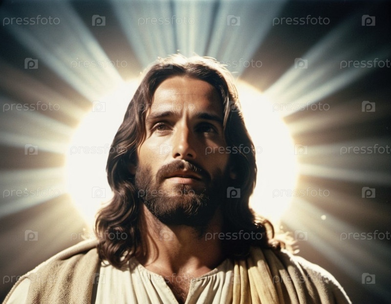 Портрет мужчины, одетого как Иисус. Белая мантия. Длинные каштановые волосы и борода. На вид мужчине около 30 лет, на лице серьезное выражение. Христианская религия и вера. Создано с помощью ИИ