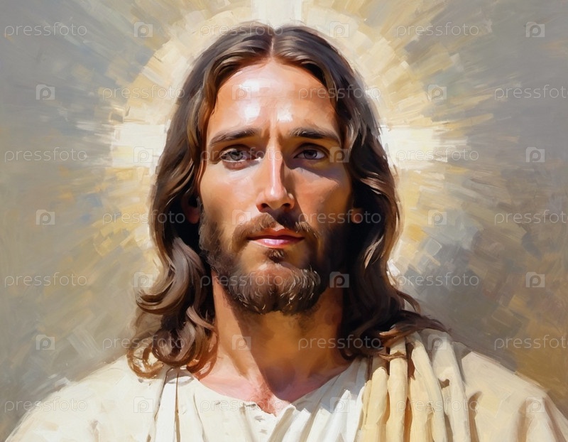 Портрет мужчины, одетого как Иисус. Белая мантия. Длинные каштановые волосы и борода. На вид мужчине около 30 лет, на лице серьезное выражение. Христианская религия и вера. Создано с помощью ИИ