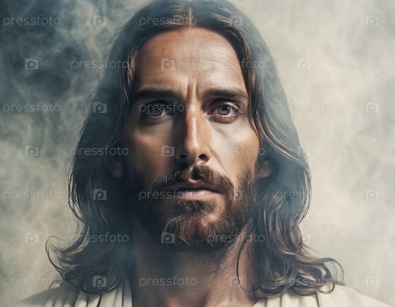 Портрет мужчины, одетого как Иисус. Белая мантия. Длинные каштановые волосы и борода. На вид мужчине около 30 лет, на лице серьезное выражение. Христианская религия и вера. Создано с помощью ИИ