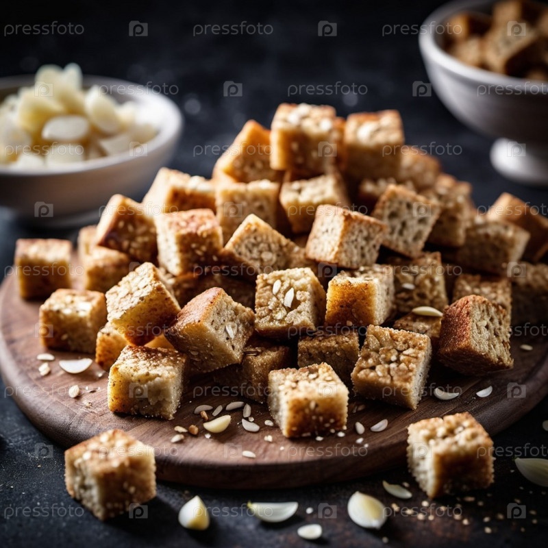 Запеченные ржаные гренки солят и настаивают на чесноке, создавая пикантную закуску, художественно оформленную в глубокой коричневой миске, окруженную. Мягкая начинка. Идеально подходит для супов, салатов или закуски к пиву