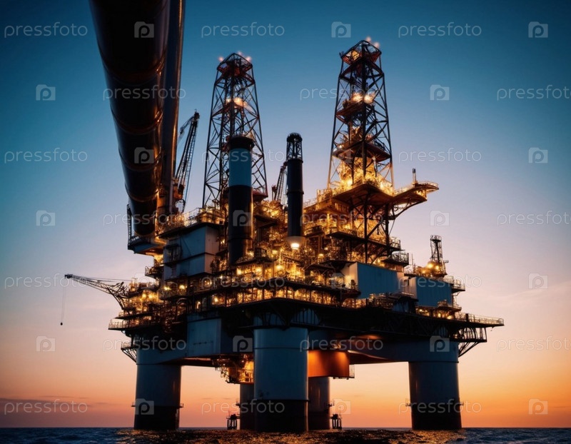 Большая, освещенная морская нефтяная вышка возвышается над водой в сумерках.Огни башни отбрасывают теплый свет на затемняющееся небо, а силуэт платформы обрамлен краем воды