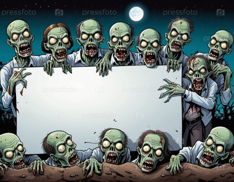 Большая группа зомби, чьи лица искажены выражением голода и разложения, держат пустой знак, их бледная, разлагающаяся кожа и пятна крови видны. Мертвые восстают на кладбище ночью. ИИ