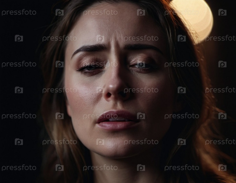 Женщина с нахмуренными бровями и обеспокоенным выражением лица смотрит прямо в камеру. Освещение тусклое, отбрасывает тени вокруг лица, подчеркивая ее стресс. Страх, разочарование, расстройство, беспокойство и задумчивость. ИИ