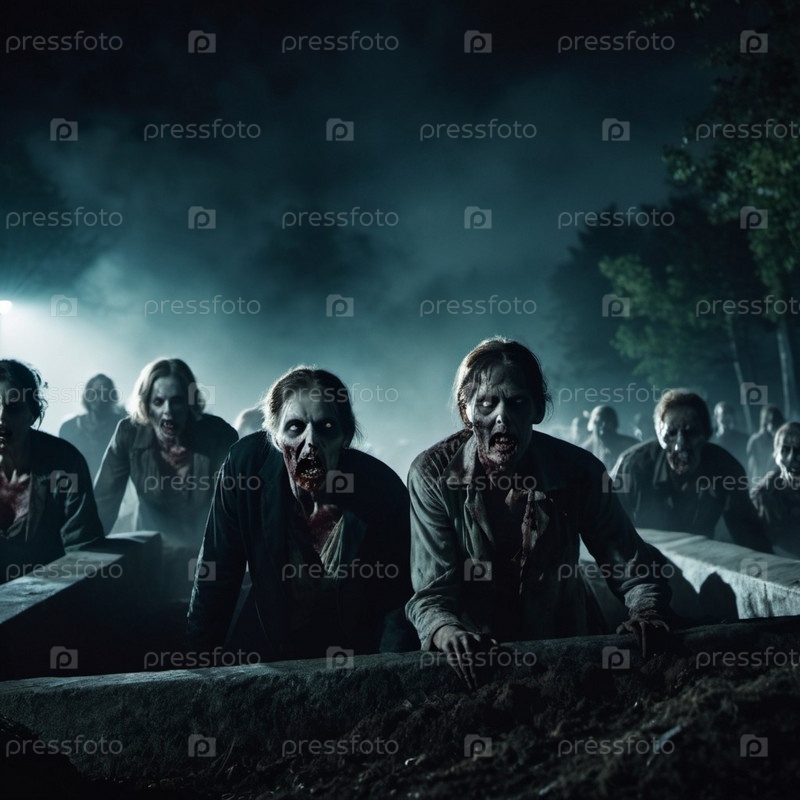 Зомби восстают из земли на тревожном кладбище. Безжизненные выражения лиц, рваная одежда раскрывают преследующее прошлое. Тусклый свет создает атмосферу ужаса. Надгробия, жуткая атмосфера, разложение и ужас. ИИ