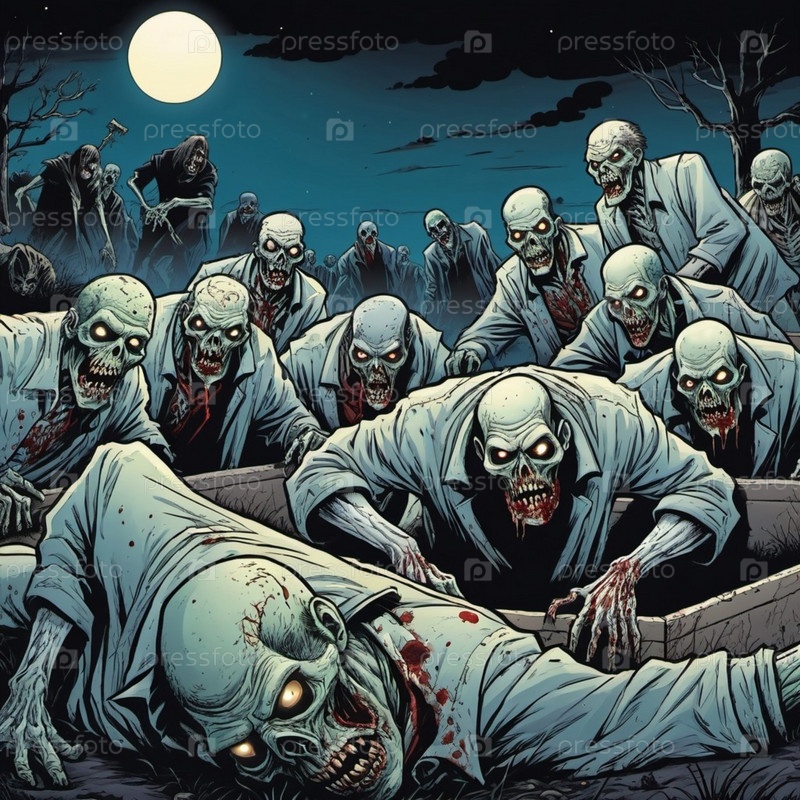 Ужасные комичные зомби появляются из могил, разложившиеся тела освещаются лунным светом. Скелетные фигуры бродят среди надгробий, в то время как другие ползают по земле, демонстрируя свой ужасный вид. ИИ