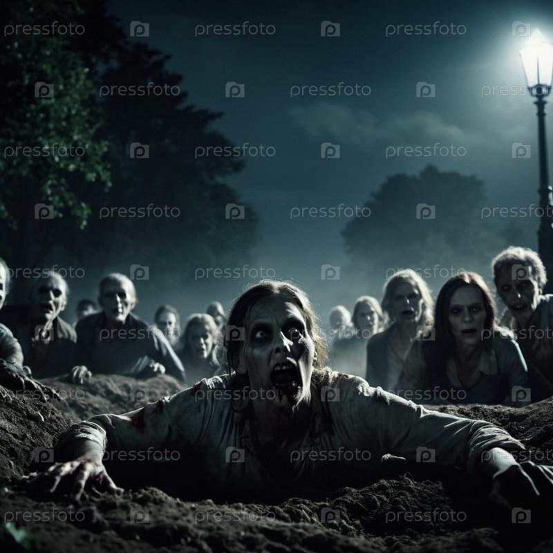 Зомби восстают из земли на тревожном кладбище. Безжизненные выражения лиц, рваная одежда раскрывают преследующее прошлое. Тусклый свет создает атмосферу ужаса. Надгробия, жуткая атмосфера, разложение и ужас. ИИ
