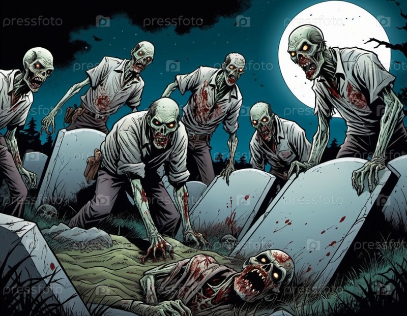 Ужасные комичные зомби появляются из могил, разложившиеся тела освещаются лунным светом. Скелетные фигуры бродят среди надгробий, в то время как другие ползают по земле, демонстрируя свой ужасный вид. ИИ