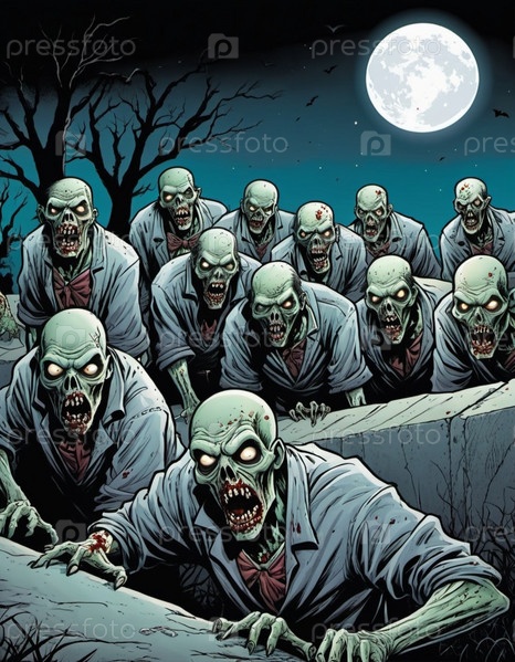 Ужасные комичные зомби появляются из могил, разложившиеся тела освещаются лунным светом. Скелетные фигуры бродят среди надгробий, в то время как другие ползают по земле, демонстрируя свой ужасный вид. ИИ
