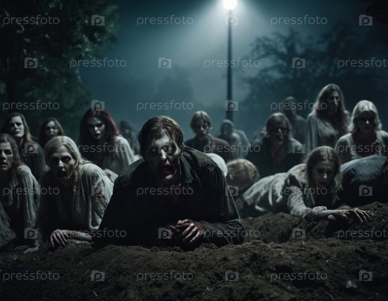 Зомби восстают из земли на тревожном кладбище. Безжизненные выражения лиц, рваная одежда раскрывают преследующее прошлое. Тусклый свет создает атмосферу ужаса. Надгробия, жуткая атмосфера, разложение и ужас. ИИ