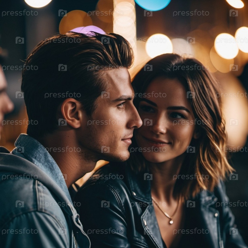 Двое друзей-любовников, мужчина и женщина, разделяют интимный момент на открытом воздухе, окруженные теплым светом, создающим волшебную атмосферу. Они смотрят друг другу в глаза, передавая чувство связи