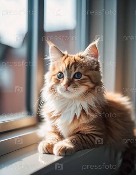 Красный котёнок с белыми пятнами и большими голубыми глазами сидит на подоконнике. Окно нефокусировано, в фоне размытый городской пейзаж. Теплая уютная атмосфера. Забота о питомце. Дом для кошки грустный