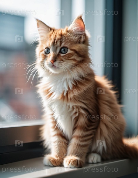 Красный котёнок с белыми пятнами и большими голубыми глазами сидит на подоконнике. Окно нефокусировано, в фоне размытый городской пейзаж. Теплая уютная атмосфера. Забота о питомце. Дом для кошки грустный