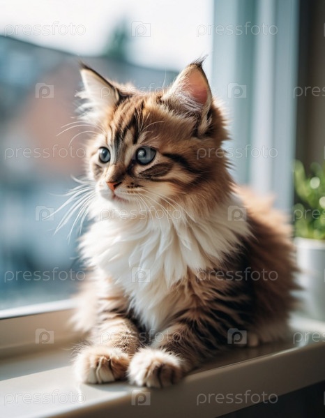 Красный котёнок с белыми пятнами и большими голубыми глазами сидит на подоконнике. Окно нефокусировано, в фоне размытый городской пейзаж. Теплая уютная атмосфера. Забота о питомце. Дом для кошки грустный