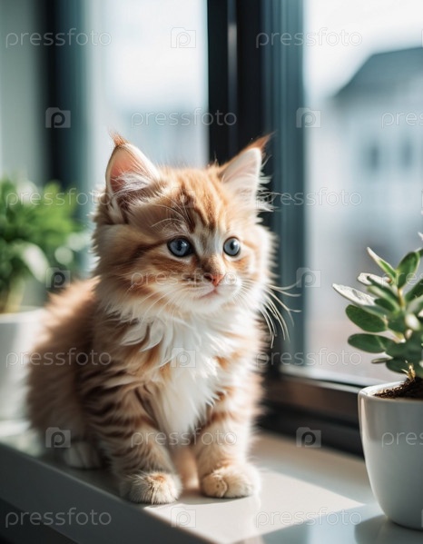 Красный котёнок с белыми пятнами и большими голубыми глазами сидит на подоконнике. Окно нефокусировано, в фоне размытый городской пейзаж. Теплая уютная атмосфера. Забота о питомце. Дом для кошки грустный