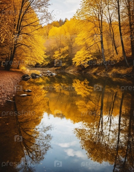 Яркие желтые листья создают потрясающую осеннюю картину вокруг спокойного озера, а отражения отражают листву на поверхности воды по мере того, как день подходит к концу. Генеративный ИИ