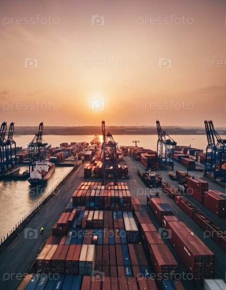 Вид с воздуха на рассвете показывает оживленный торговый порт с аккуратно сложенными контейнерами и кранами, готовыми к работе. Спокойные воды отражают мягкий утренний свет. Промышленная деятельность. Генеративный ИИ