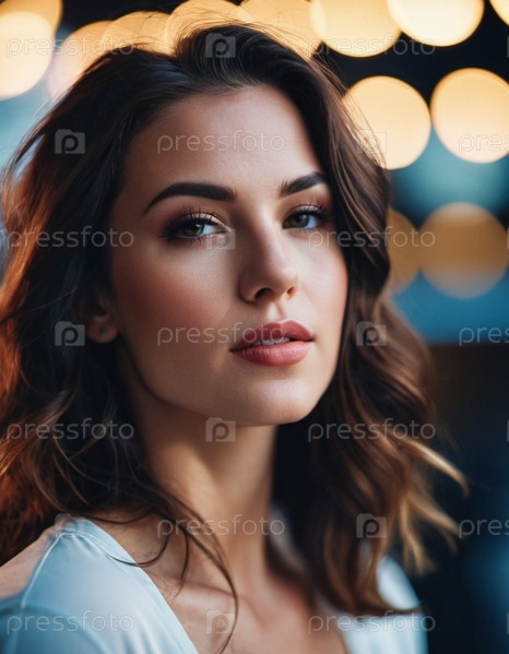 Молодая американка позирует с безмятежным выражением лица, ее волосы мягко обрамляют лицо. Фон освещен теплыми круговыми огнями, создавая мечтательную атмосферу. Яркий вечер в городе. Генеративный ИИ